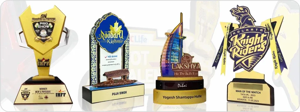 Ready-stock trophies are pre-made designs that can be quickly customised with: