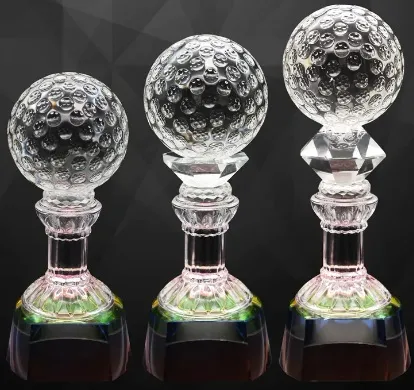 Crystal trophies are a favourite for golf events with a more formal tone. Designs include crystal golf balls mounted on pedestals, tall pillars, or metal golfers attached to a crystal base — all beautifully laser engraved or UV-printed with your logo and tournament name.